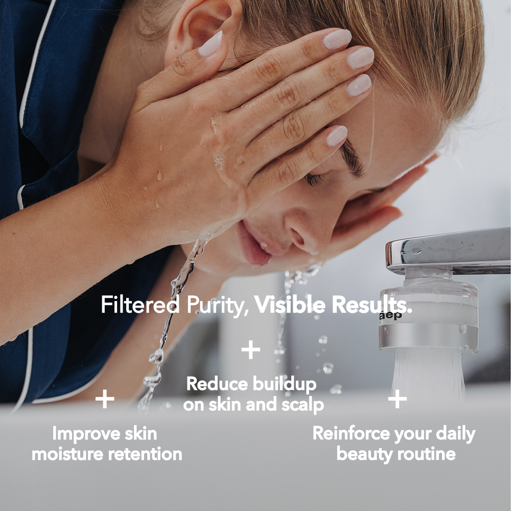 Chlorine, chalk, bacteria, and microplastics dry out skin, clog pores, and speed up aging. Our filter removes them, turning tap water into pure skincare.
